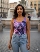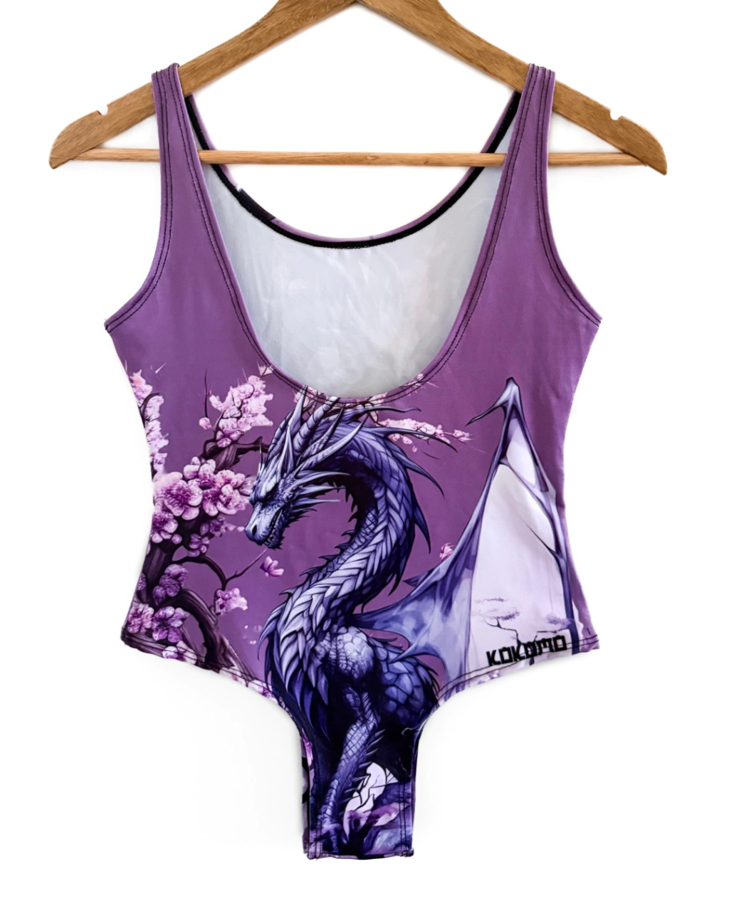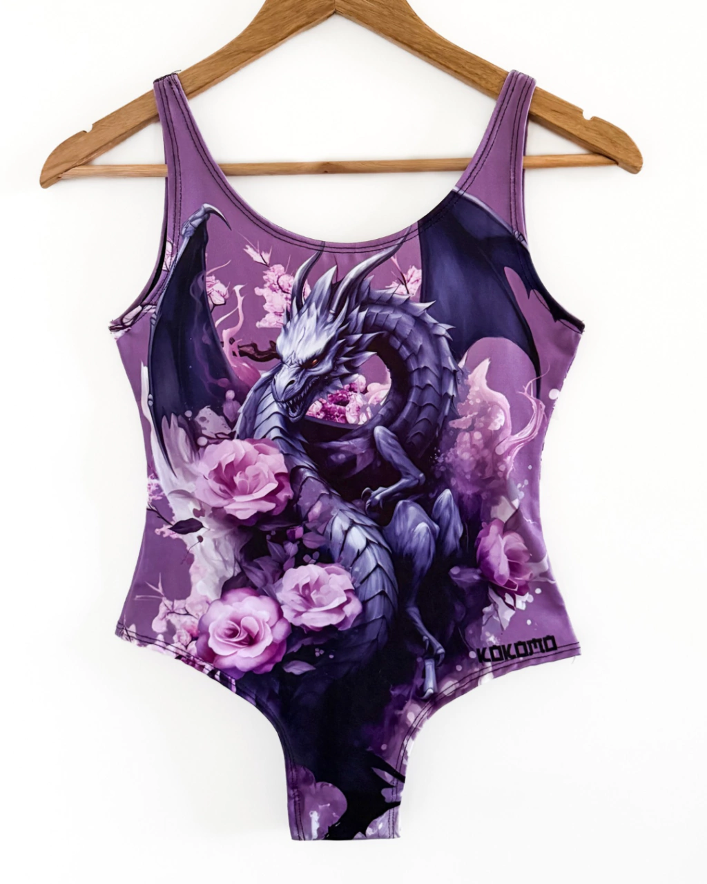 Libera tu espíritu indomable con esta pieza única. Este traje de baño enterizo con un impresionante diseño de dragón en tonos morados y violetas es perfecto para la piscina, la playa o para lucir como un audaz body en tu outfit diario.