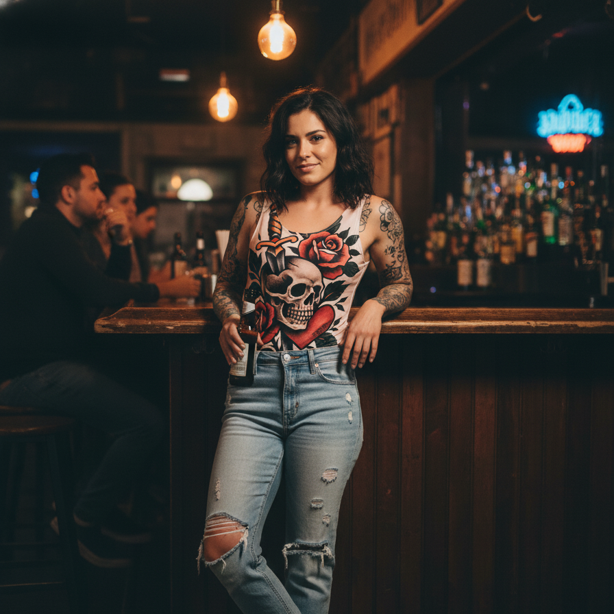 - Versatilidad Total: Combínalo como en la foto con tus jeans rotos favoritos y zapatillas para un look de bar, conciertos o día a día. También queda genial con faldas de cuero o pantalones negros de tiro alto para una noche más formal.