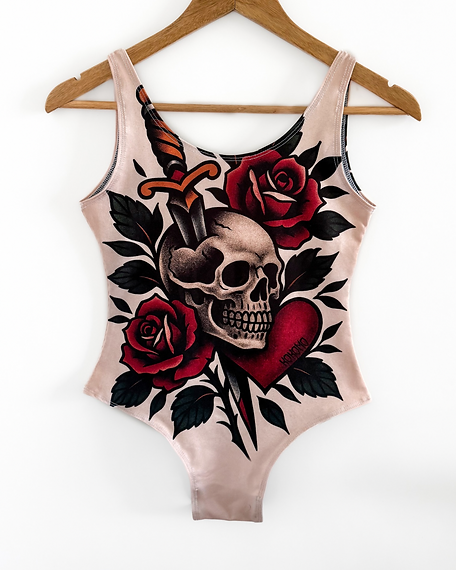 Inspirado en el clásico arte del tatuaje Old School, este body presenta un diseño espectacular de calavera, rosas rojas vibrantes y daga. Es la pieza perfecta para quienes aman destacar y mostrar un toque de rebeldía chic.