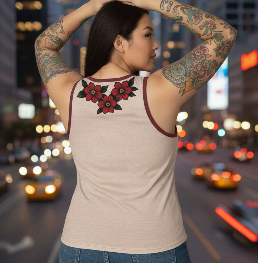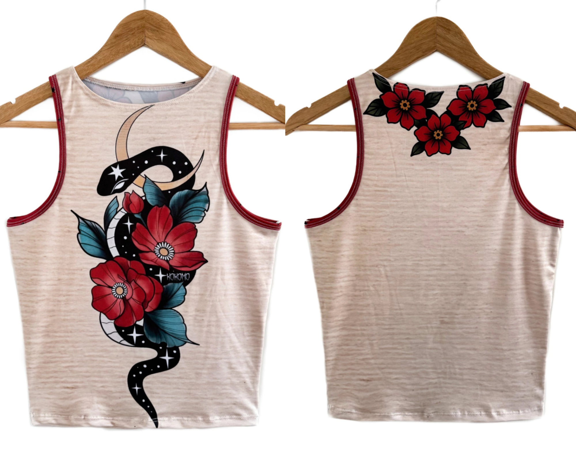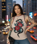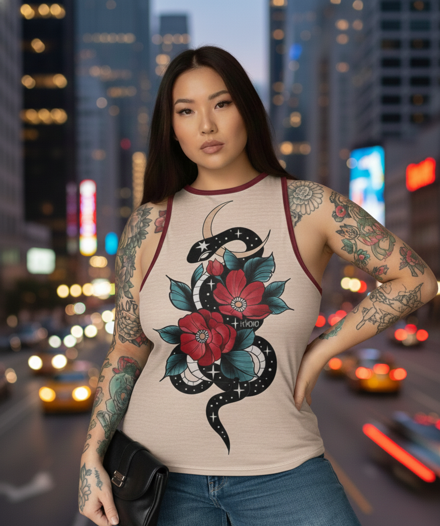 Eleva tu estilo urbano con la musculosa Snake, una pieza de diseño auténtico que fusiona el arte del tatuaje tradicional con una estética cósmica. Confeccionada en lycra premium, esta prenda ofrece un ajuste perfecto que realza la figura sin perder la comodidad.