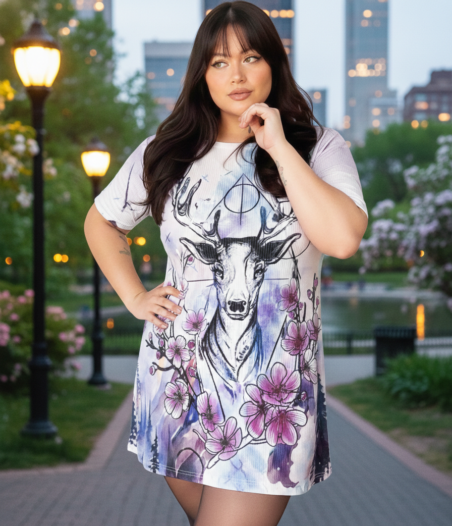 Su gran diferencial es que es 100% reversible: podés lucir un lado inspirado en el misticismo del bosque con el ciervo sagrado y flores, o darla vuelta para revelar un paisaje arquitectónico de ensueño bajo un cielo estrellado.