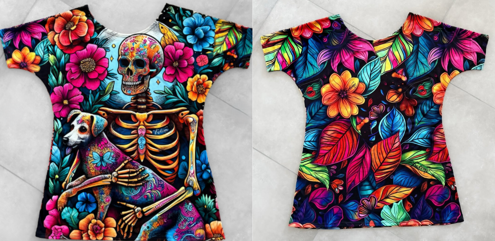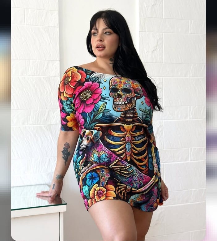 - Su gran valor reside en su versatilidad reversible: de un lado, una ilustración detallada de un esqueleto rodeado de flores y un leal compañero canino en un estallido de colores; del otro, un patrón continuo de follaje tropical psicodélico que llena de energía cualquier conjunto.