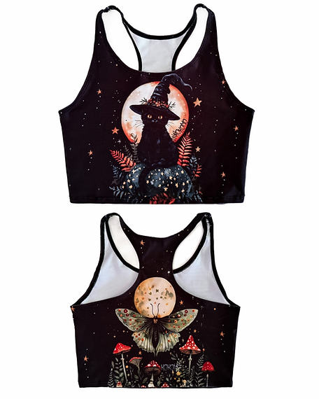 Este crop top no es solo una prenda, es una declaración de estilo para las amantes de lo esotérico, la naturaleza y la magia. Con un diseño exclusivo que presenta una adorable gata negra con sombrero de bruja bajo la luna creciente, rodeada de estrellas y helechos, ¡serás el centro de todas las miradas!