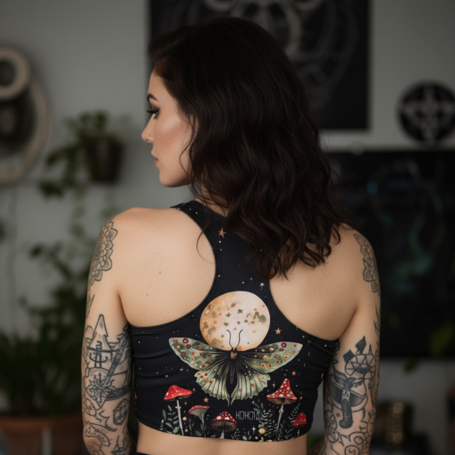 - Espalda Sorprendente: En la parte trasera, una hermosa polilla lunar en un jardín de hongos bajo la luna completa el ambiente mágico.